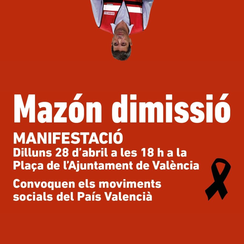Dilluns 28 d'abril de 2025, a les 18.00 h, des de la Plaça de l'Ajuntament, en València, eixirem als carrers a manifestar-nos per sisena vegada des de la riuada del 29 d'octubre de 2024, per a exigir la dimissió del molt poc honorable Carlos Arturo Mazón Guixot, president de la Generalitat Valenciana.