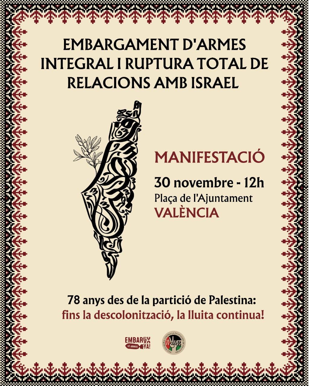 Dissabte, 30 de novembre a les 12.00 h, ens unim a la manifestació que recorrerà els carrers de València, des de la Plaça de l'Ajuntament, per a exigir el cessament total del comerç d'armes, la ruptura de relacions amb Israel i la fi de la colonització de Palestina.