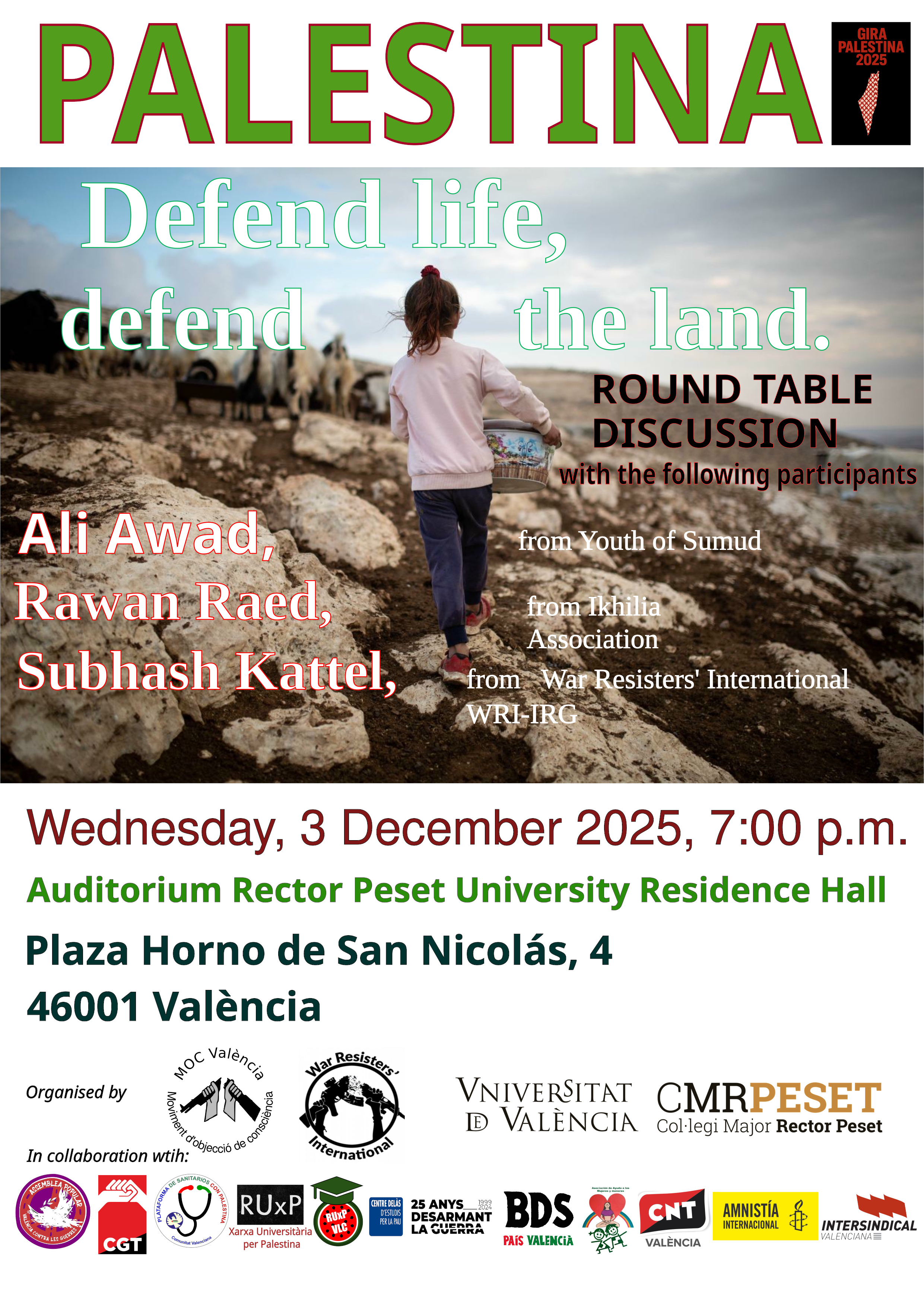 We have three peace activists, two from the West Bank and one from Nepal, who will share their experiences with us. Ali Awad, Rawan Raed, and Subhash Kattel are participating in the International War Resisters' Meeting “Disarm Militarism: Resist War, Build Peace”, from November 27 to 29, 2025, in Barcelona, a meeting point for a broad and diverse network of anti-militarist and pacifist activists from around the world. These individuals and their groups are trying to put a stop to a world in rearmament, where leaders are increasing military spending, reducing resources for vital social and ecological needs, and thus promoting the death, destruction, and authoritarianism produced by more than fifty ongoing wars.