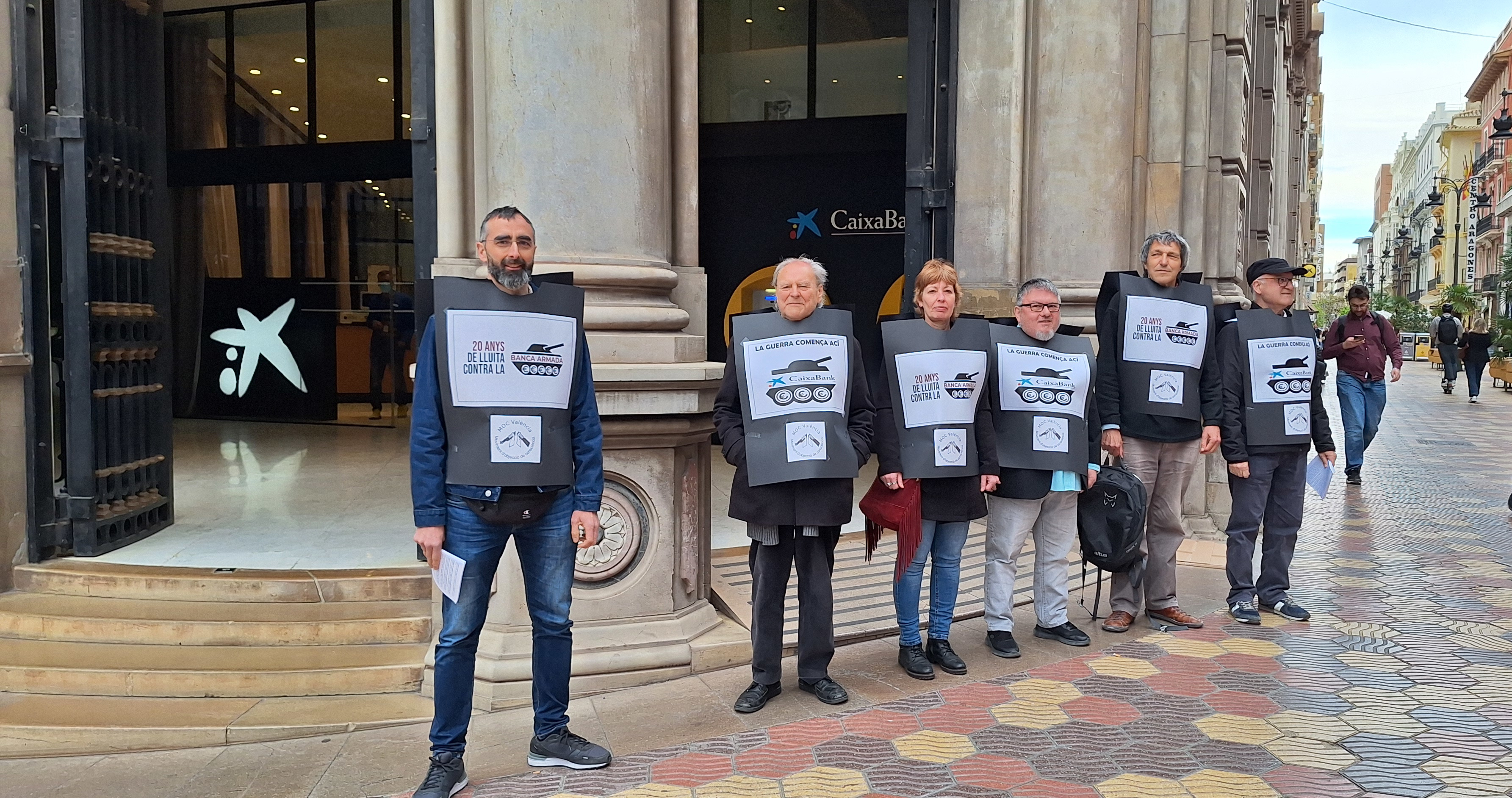 Yesterday, Thursday, a group of activists from MOC-València staged a protest outside CaixaBank’s headquarters. They condemned the bank’s investments in arms companies and its funding of illegal settlements in the occupied Palestinian territories.