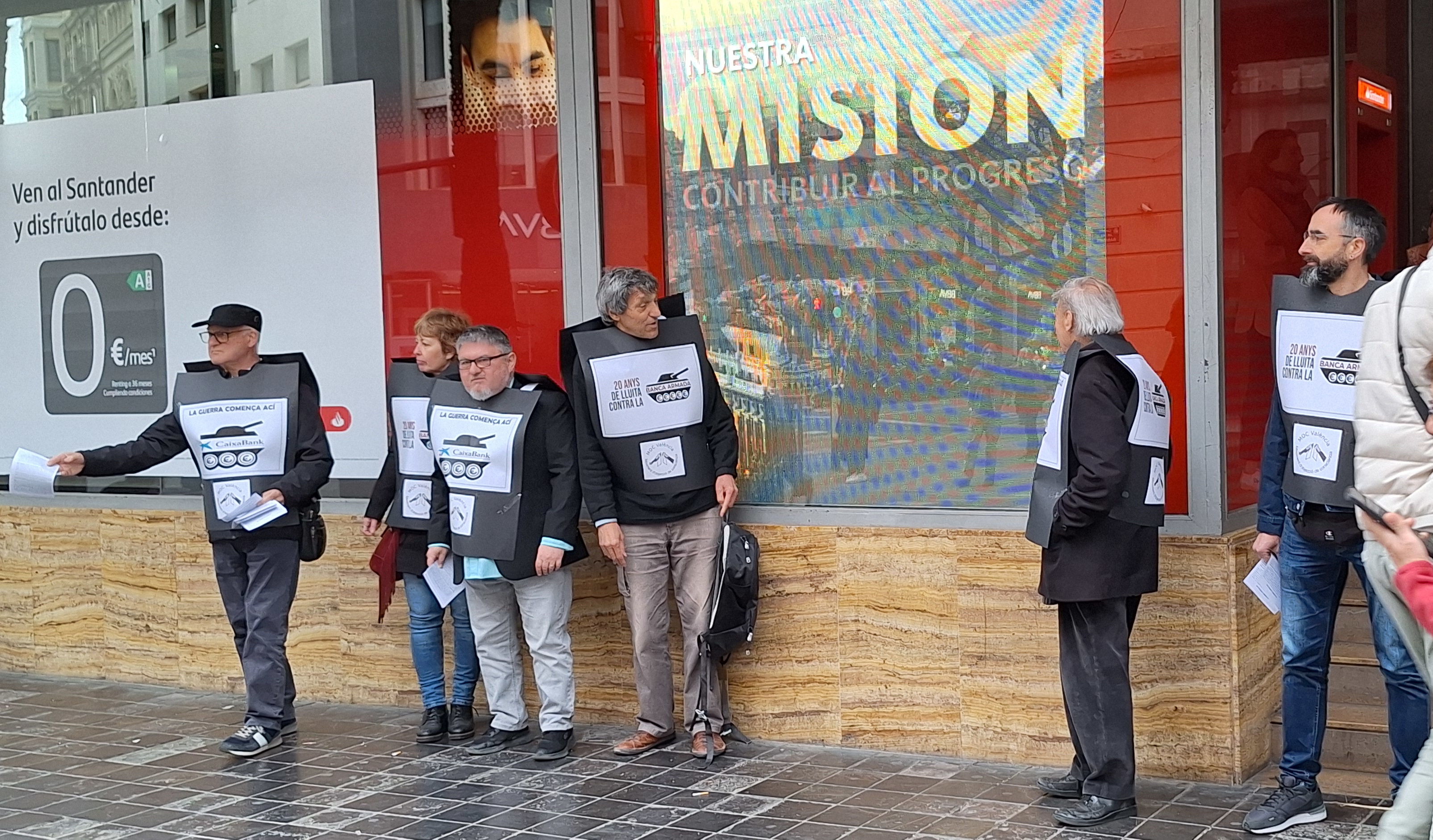 Activists, displaying posters from the “No to Arms-Dealing Banks” campaign, have urged customers of CaixaBank and other banks that invest in the arms industry – such as Banco Santander and BBVA – to withdraw their savings, pay packets and current accounts from these institutions, and to seek out savings banks and financial institutions that do not fuel wars. They also pointed out that only civilised civil society, rising above political and financial interests, can stop wars and make a world of peace, justice, equality and freedom possible.