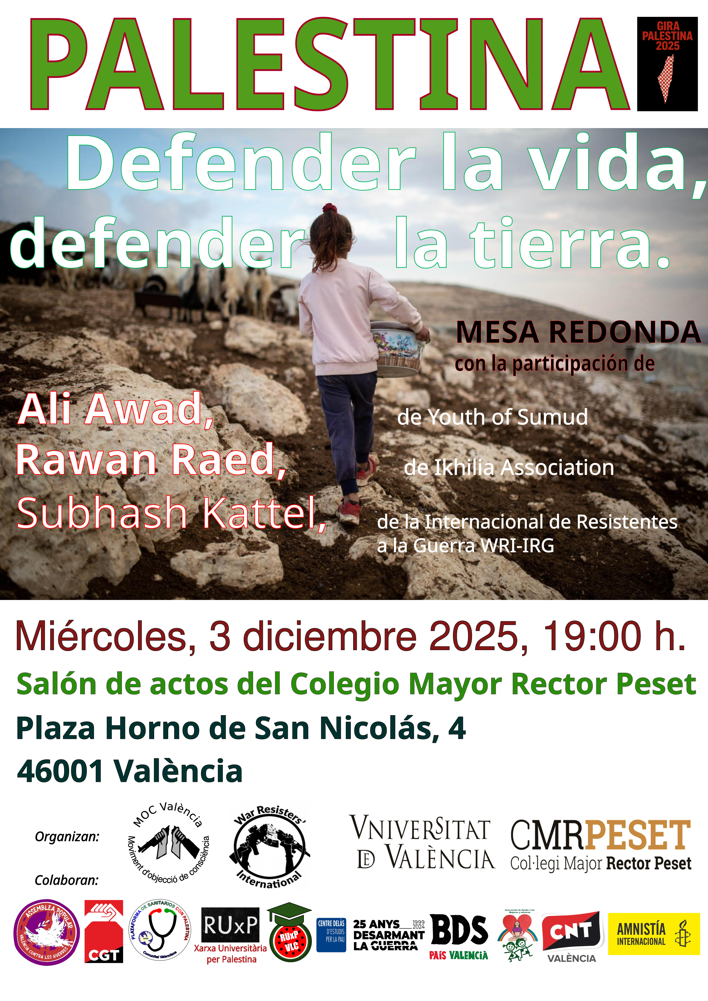 Contamos con tres activistas por la paz, dos de Cisjordania y otro del Nepal que nos contarán sus experiencias. Ali Awad, Rawan Raed y Subhash Kattel participan en el encuentro de la Internacional de Resistentes en la Guerra “Desarmar el militarismo: Resistir la guerra, construir la paz”, del 27 al 29 de noviembre de 2025, en Barcelona, un punto de reunión para una amplia y diversa red de activistas antimilitaristas y pacifistas de todo el mundo. Estas persones y sus colectivos tratan de hacer frente a un mundo en rearme, donde sus dirigentes aumentan los gastos militares, disminuyendo recursos para las necesidades vitales, sociales y ecológicas, fomentando así la muerte, la destrucción y el autoritarismo que producen las más de cincuenta guerras vigentes.