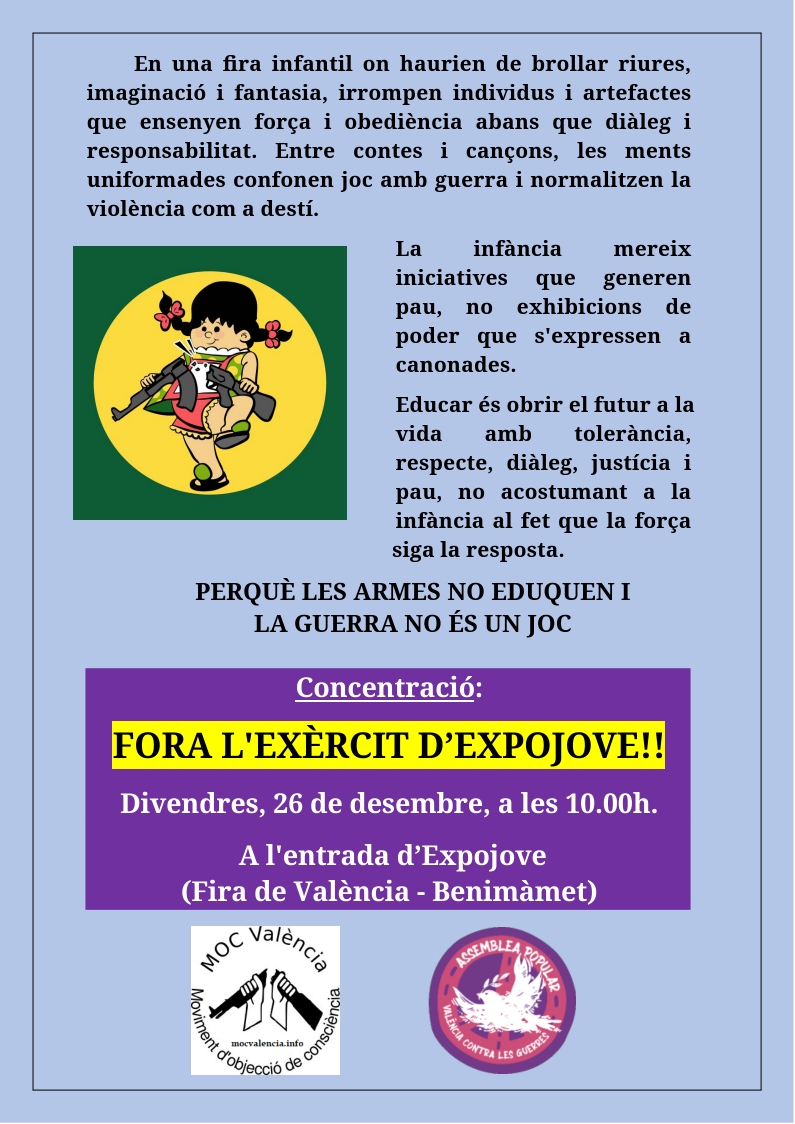 En aquest context, denunciem i rebutgem l'adoctrinament militarista que es presenta en la Fira de la infància i la joventut ExpoJove, amb l'exhibició i l'enaltiment de l'exèrcit i el seu material per a la guerra disfressat de joc innocu i divertit.