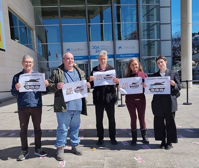 Hui, integrants de la campanya #BancaArmada ens hem manifestat, a València, a les portes del Palau de Congressos contra la junta d'accionistes de CaixaBank.