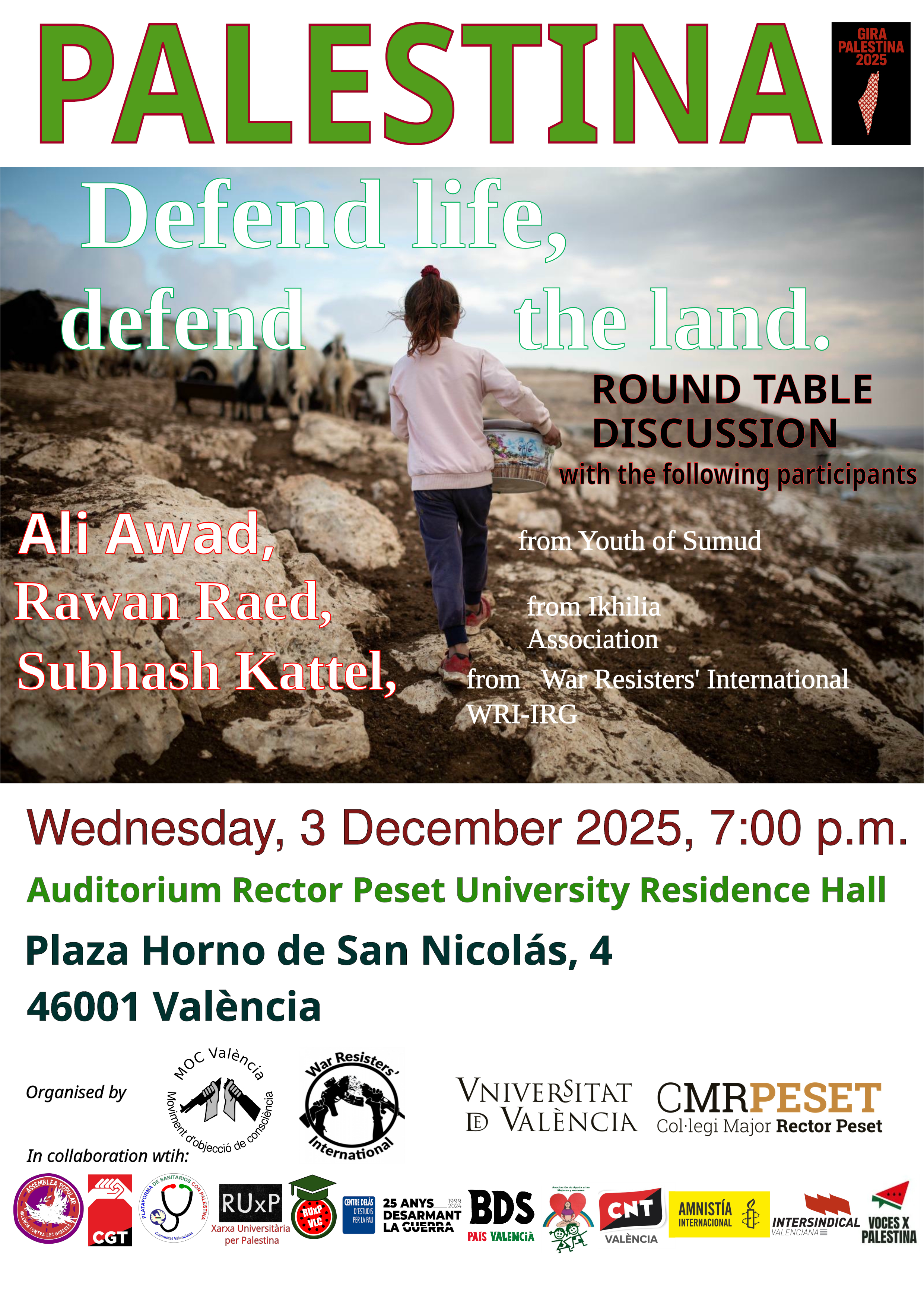 We have three peace activists, two from the West Bank and one from Nepal, who will share their experiences with us. Ali Awad, Rawan Raed, and Subhash Kattel are participating in the International War Resisters' Meeting “Disarm Militarism: Resist War, Build Peace”, from November 27 to 29, 2025, in Barcelona, a meeting point for a broad and diverse network of anti-militarist and pacifist activists from around the world. These individuals and their groups are trying to put a stop to a world in rearmament, where leaders are increasing military spending, reducing resources for vital social and ecological needs, and thus promoting the death, destruction, and authoritarianism produced by more than fifty ongoing wars.