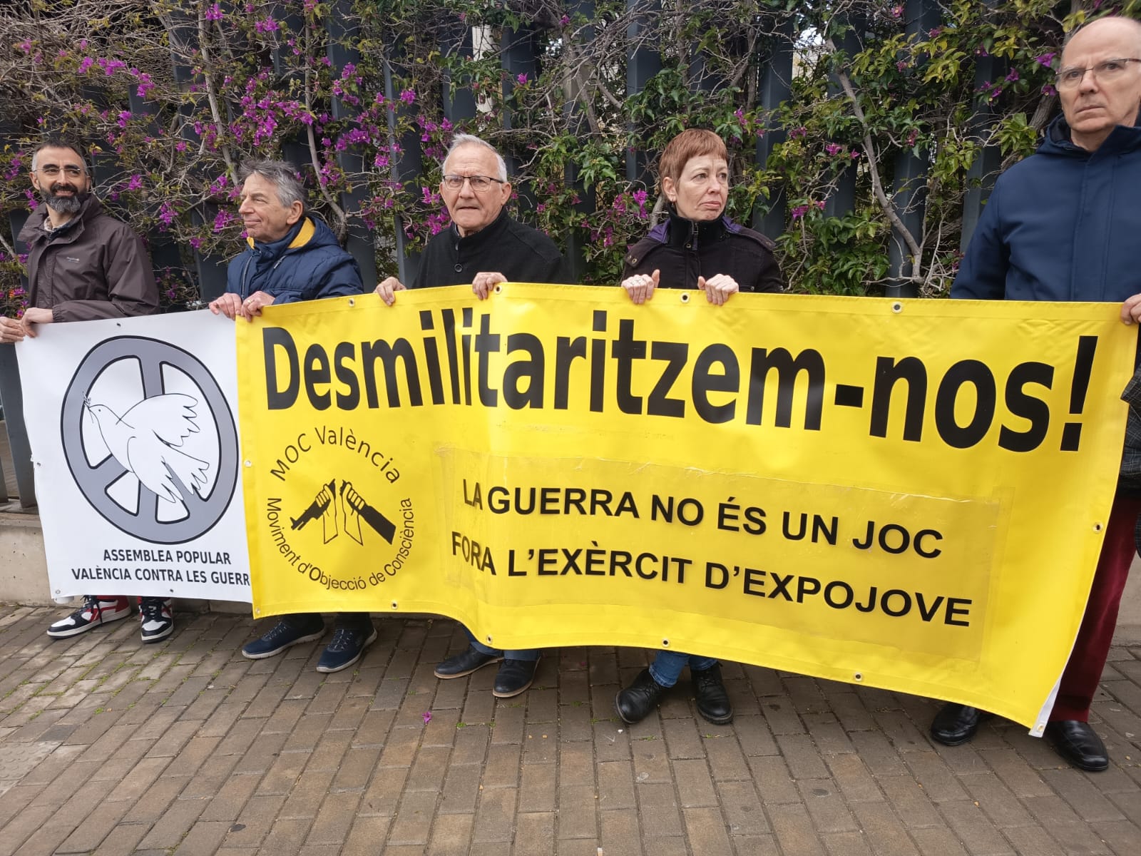 This morning, activists from MOC-València and the Assemblea Popular València Contra les Guerres gathered outside Feria València during the opening of Expojove 2025, to protest against the presence of exhibitors from the Armed Forces and the UME (Military Emergency Unit) at the children's and youth fair in Valencia.