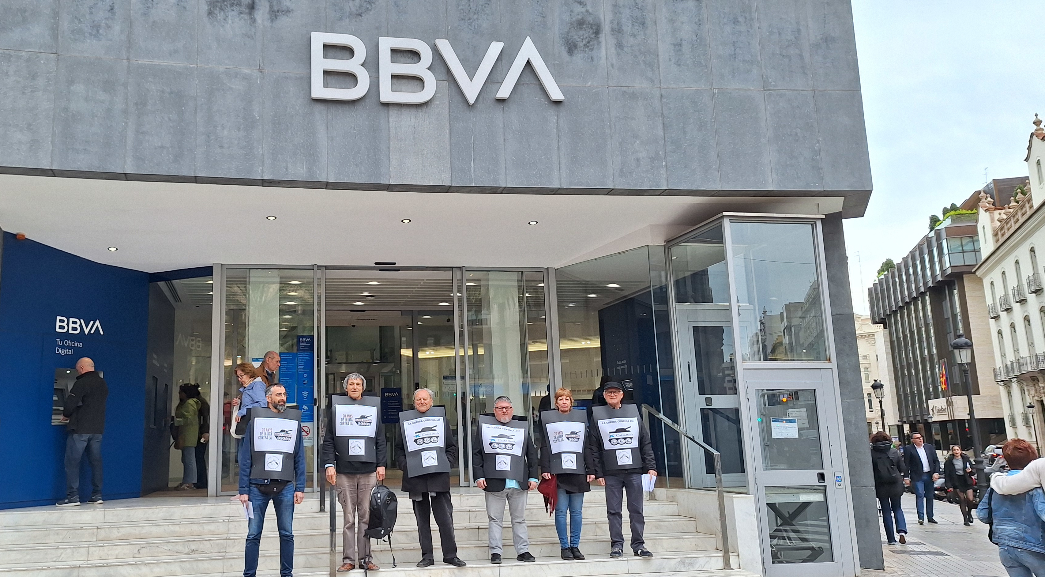 Activists, displaying posters from the “No to Arms-Dealing Banks” campaign, have urged customers of CaixaBank and other banks that invest in the arms industry – such as Banco Santander and BBVA – to withdraw their savings, pay packets and current accounts from these institutions, and to seek out savings banks and financial institutions that do not fuel wars. They also pointed out that only civilised civil society, rising above political and financial interests, can stop wars and make a world of peace, justice, equality and freedom possible.