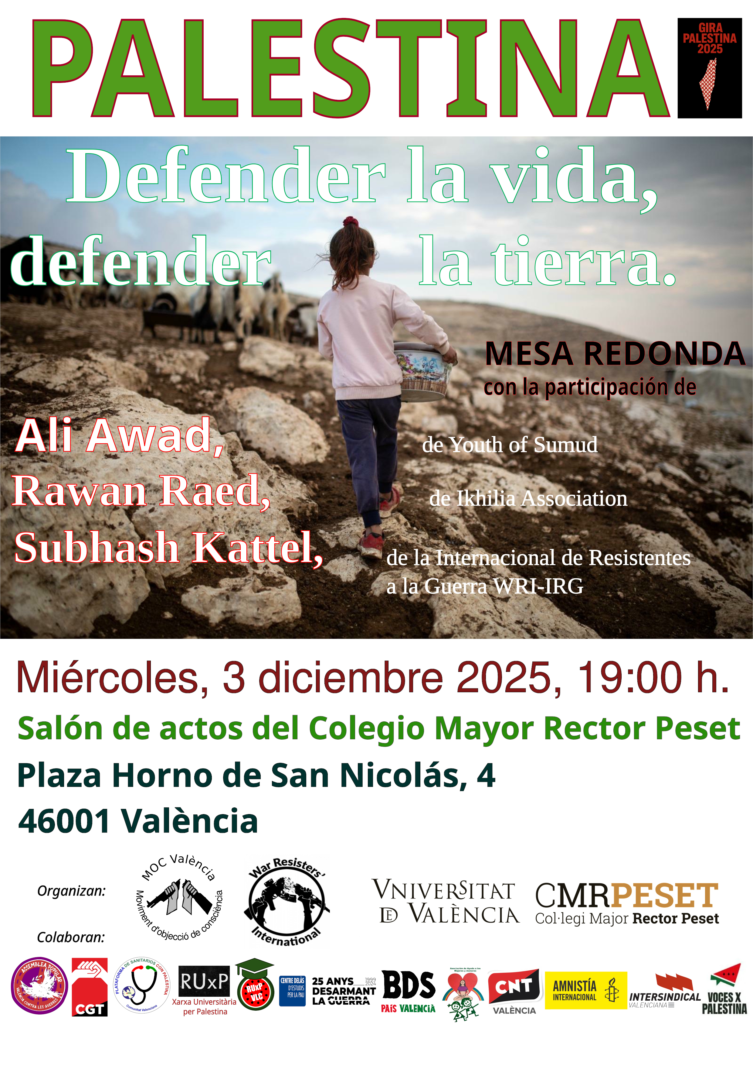 Contamos con tres activistas por la paz, dos de Cisjordania y otro del Nepal que nos contarán sus experiencias. Ali Awad, Rawan Raed y Subhash Kattel participan en el encuentro de la Internacional de Resistentes en la Guerra “Desarmar el militarismo: Resistir la guerra, construir la paz”, del 27 al 29 de noviembre de 2025, en Barcelona, un punto de reunión para una amplia y diversa red de activistas antimilitaristas y pacifistas de todo el mundo. Estas persones y sus colectivos tratan de hacer frente a un mundo en rearme, donde sus dirigentes aumentan los gastos militares, disminuyendo recursos para las necesidades vitales, sociales y ecológicas, fomentando así la muerte, la destrucción y el autoritarismo que producen las más de cincuenta guerras vigentes.