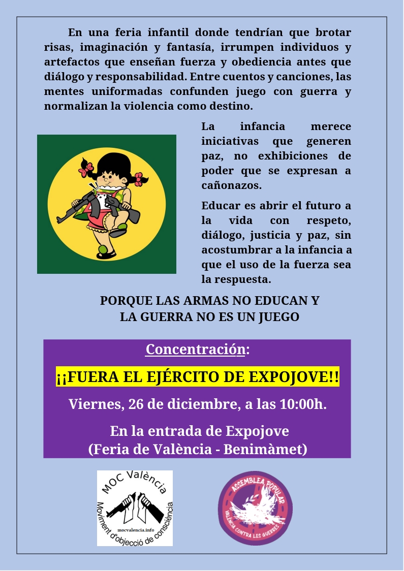 En este contexto, denunciamos y rechazamos el adoctrinamiento militarista que se presenta en la Feria de la infancia y la juventud “Expojove” con la exhibición y el enaltecimiento del ejército y su material para la guerra disfrazado de juego inocuo y divertido.